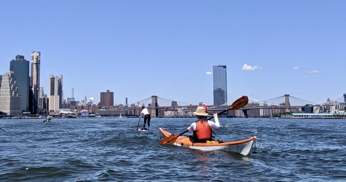From the Pier 84 Boathouse in the Hudson River Park, we kayak and SUP through the NY Harbor’s Upper Bay. We experience stunning scenic panoramas and bumpy water. After we land on the beach, the group decides together to get crab, BBQ, pie or drinks. Whatever we choose, we burn it off on the way back, covering 15 miles round trip.